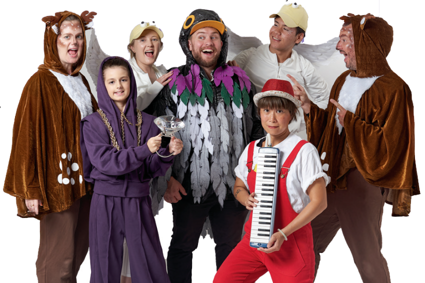 Актьорският състав на Peace on Earth: A Pigeon’s Story, ново семейно шоу на Treasure Chest Theatre, което ще бъде поставено като част от Clockenflap 2025, се събира за фотосесия.
