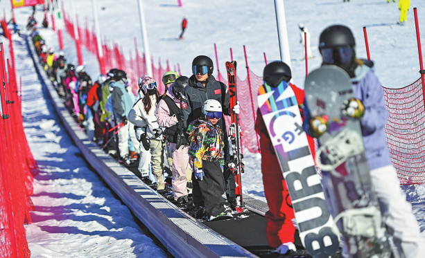 Ски ентусиасти карат вълшебен килимен лифт в курорт в Кингжу, провинция Шандонг, на 11 януари. WANG JILIN/ЗА КИТАЙ ДАЙЛИ