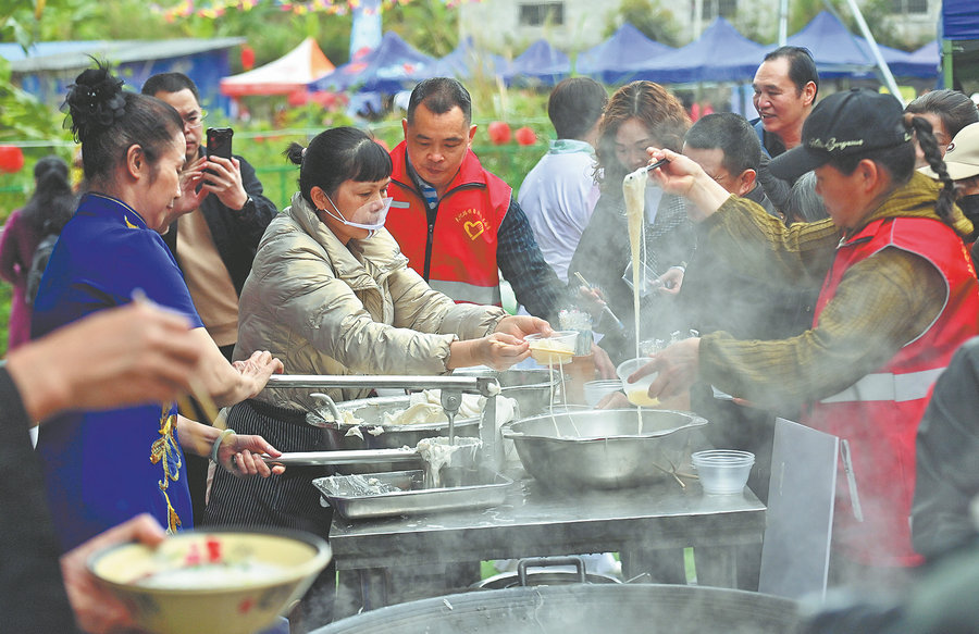 Купички с варени на пара оризови спагети се сервират на събитие за дегустация по време на състезание по изработка на нематериално културно наследство в автономния окръг Дахуа Яо, град Хечи в автономния регион Гуанси Джуанг. [Photo/Xinhua]