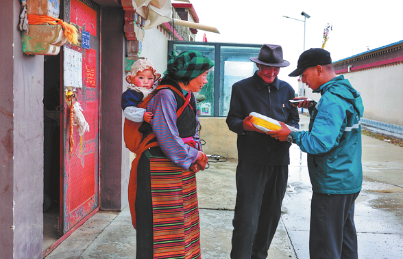 Жителите на Тибет получават колет от куриер (вдясно) в окръг Накарзе, автономен регион Ксизанг, през август. КИТАЙ ДЕЙЛИ
