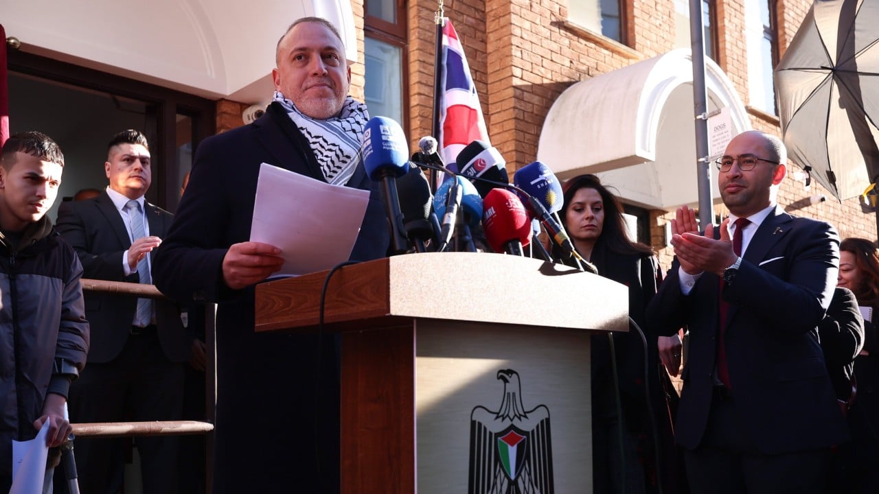 „Събираме се днес, за да отбележим исторически момент – откриването на посолството на Държавата Палестина в Великобританияс пълен дипломатически статут и привилегии“, каза Хузам Зомлот в реч пред мястото, известно преди това като Палестинската мисия в Обединеното кралство в западен Лондон. Официалното повишаване на статута на мисията до статут на посолство дойде, след като Обединеното кралство обяви, че ще признае държавата Палестина през септември 2025 г., заедно с няколко други страни, вкл. Австралия и Канадавъв време на голяма международна загриженост относно хуманитарната ситуация в Газа. Носейки традиционен черно-бял шал кефия, Зомлот каза на церемонията, че това „не е просто промяна на името“, а „промяна на посоката“ към палестински държавност.
