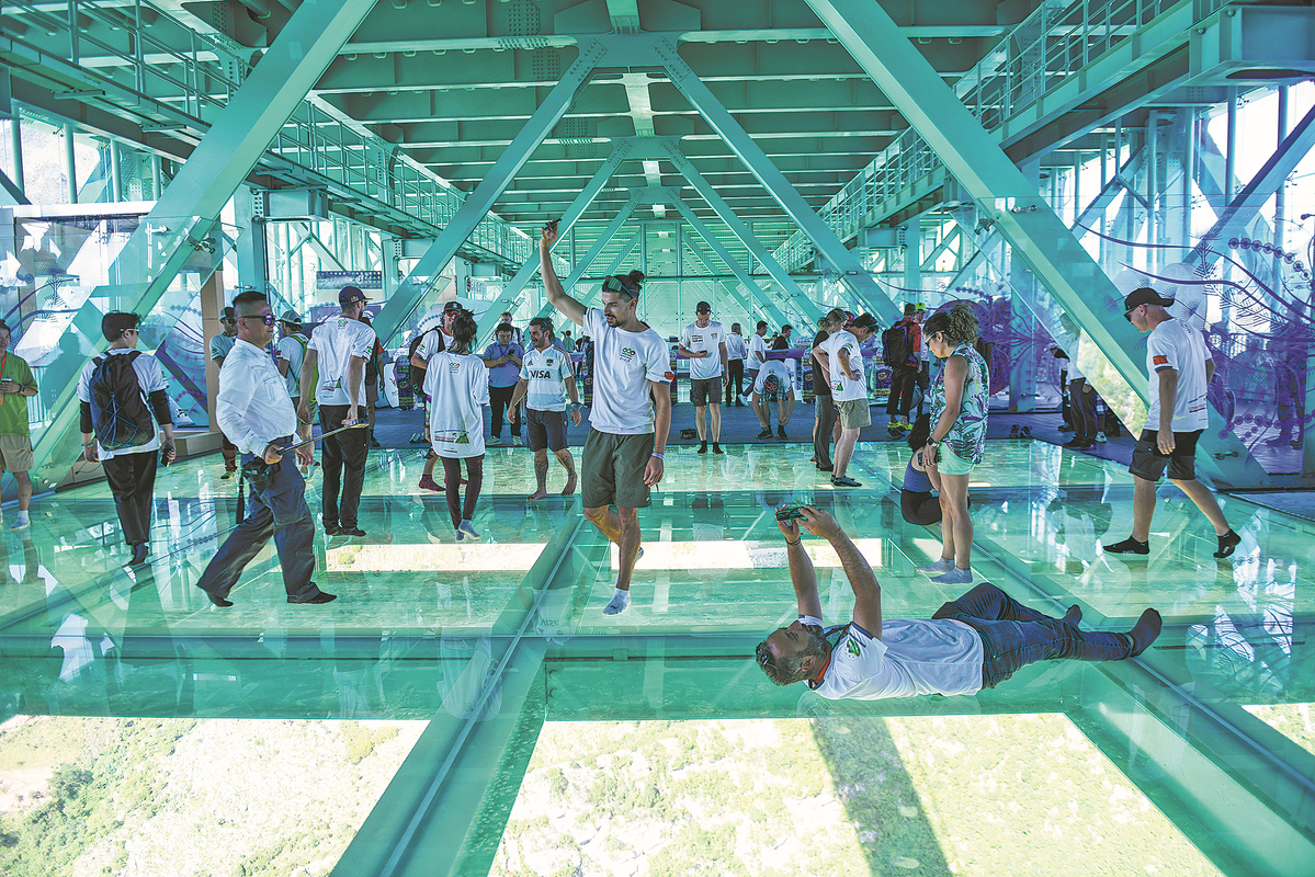 Чуждестранните посетители изживяват остъклената зала за наблюдение на моста Huajiang Grand Canyon в провинция Гуейджоу през септември. Твърди се, че мостът е сред най-високите в света.[Photo by Liu Chaofu/For China Daily]
