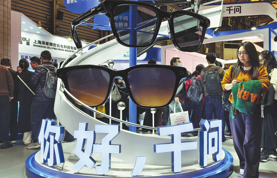 Посетителите се събират на щанда на Qwen, LLM на Alibaba, по време на високотехнологично изложение в Шанхай на 15 март. CHEN YUYU/FOR CHINA DAILY