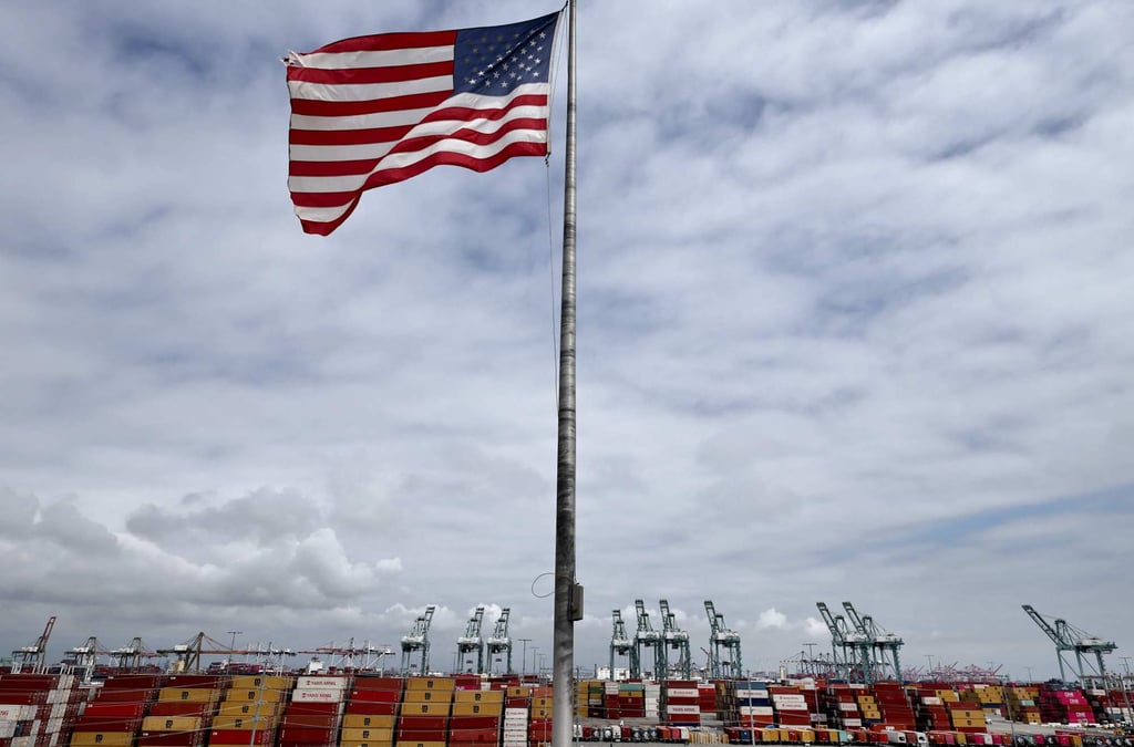 Американски флаг лети пред контейнери за доставка и кранове в пристанището на Лос Анджелис миналата седмица в Калифорнийския град. Снимка: AFP