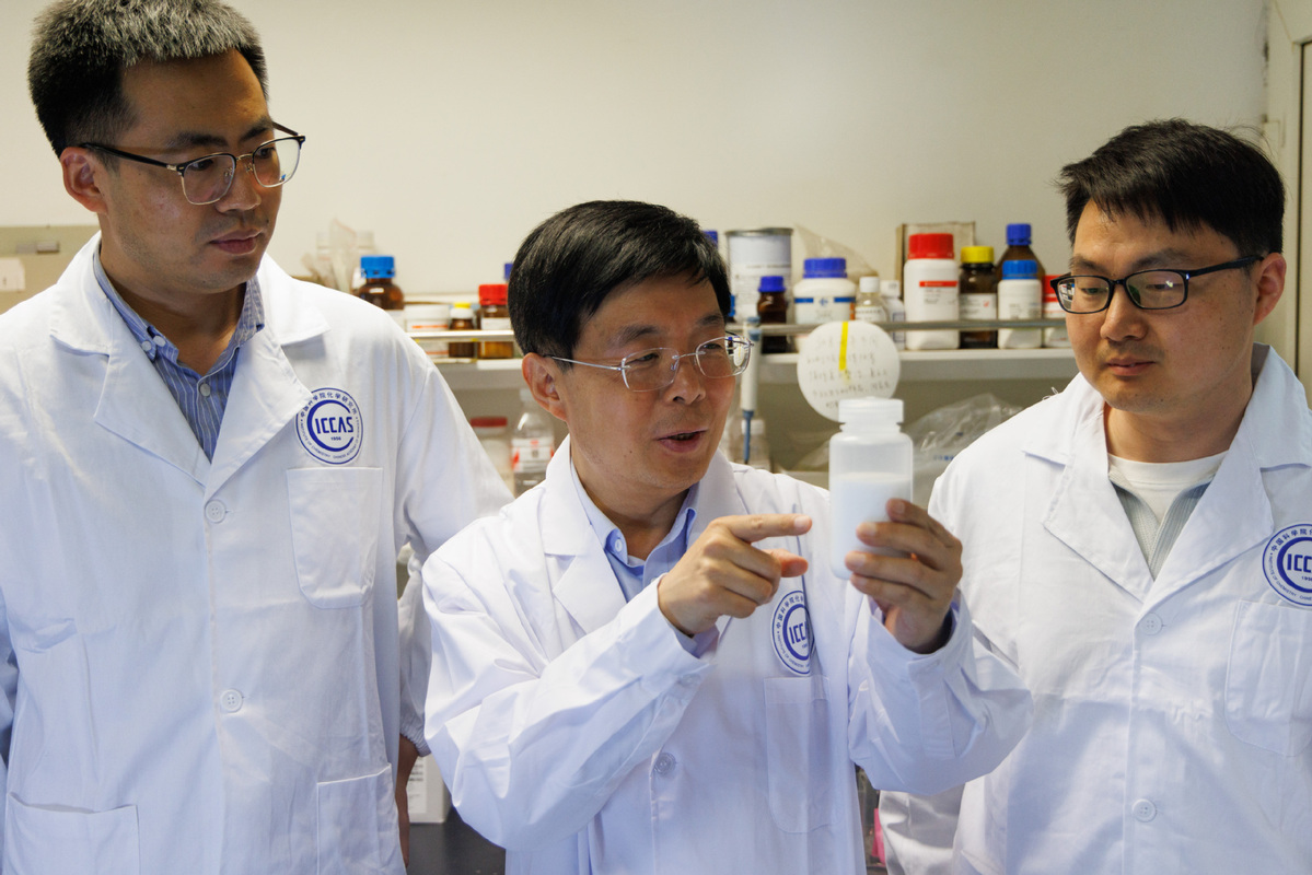 Изследователят Song Yanlin (C), асоциираният изследовател Li Huizeng (L) и доктор Li Kaixuan общуват в лабораторията на Института по химия, Китайската академия на науките (ICCAS), в Пекин, 20 април 2026 г. [Photo/Xinhua]