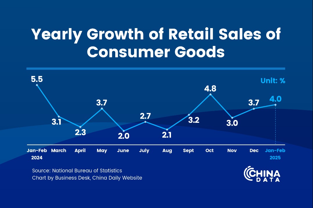 Fixed-asset investment – a gauge of expenditures on items including infrastructure, property, machinery and equipment – increased by 4.1 percent over the January-February period year-on-year, compared with a 3.2 percent rise for the whole year of 2024.