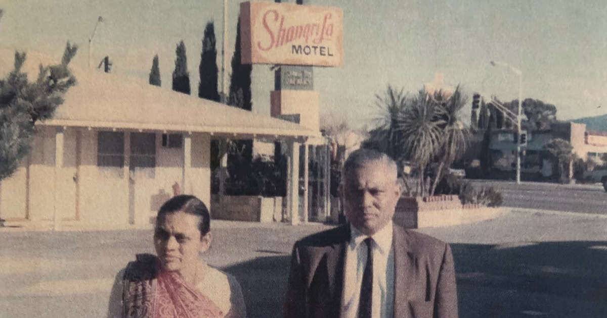“The Patel Motel Story” explores the history of Indian immigrants in the US hotel industry. The short film includes this photo of Dhayabhai Patel and Santaben Patel, in front of a motel their family once owned in Palo Alto, California. — Photo by Courtesy Amar Shah and Rahul Rohatgi