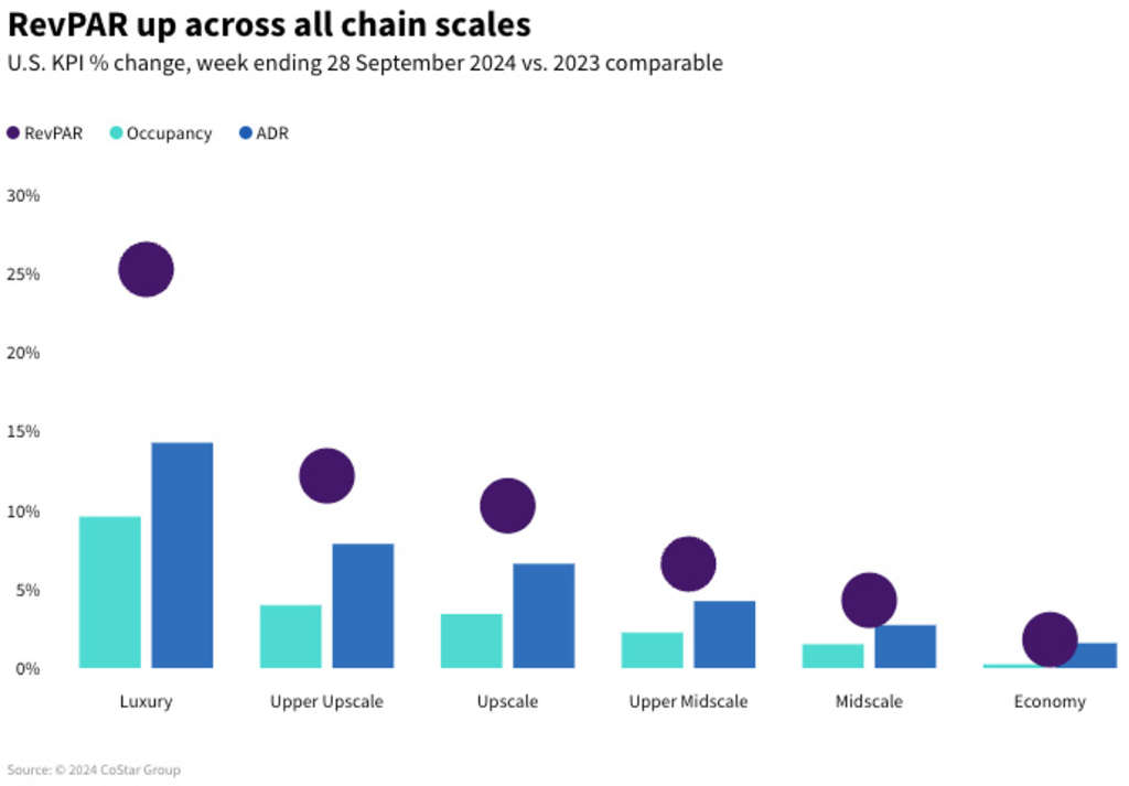 Revenue per available room (RevPAR) rose 10.2% year over year (YoY) for the week ending 28 September 2024, driven by a 7.5% increase in average daily rate (ADR). The ADR gain was the largest of the past 80 weeks.