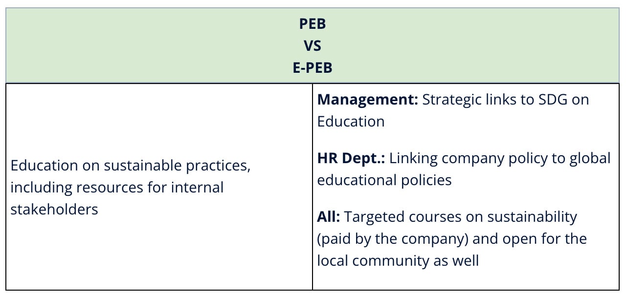 - E-PEB means addressing both internal practices and external activities in a more holistic way, involving everyone from front-line staff to leadership.