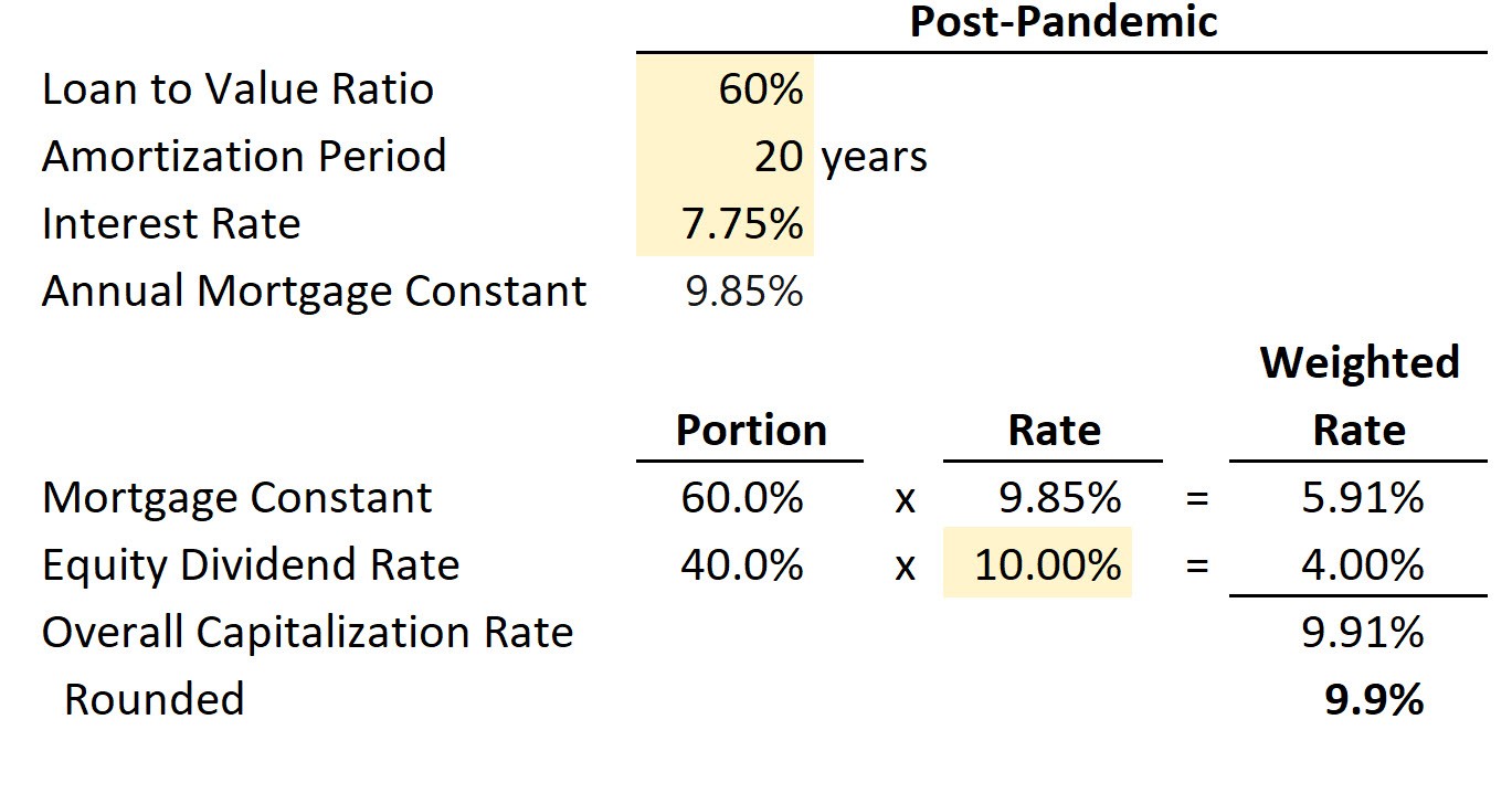 The following table revisits the band-of-investment technique using debt parameters that are more typical of the post-pandemic reality.