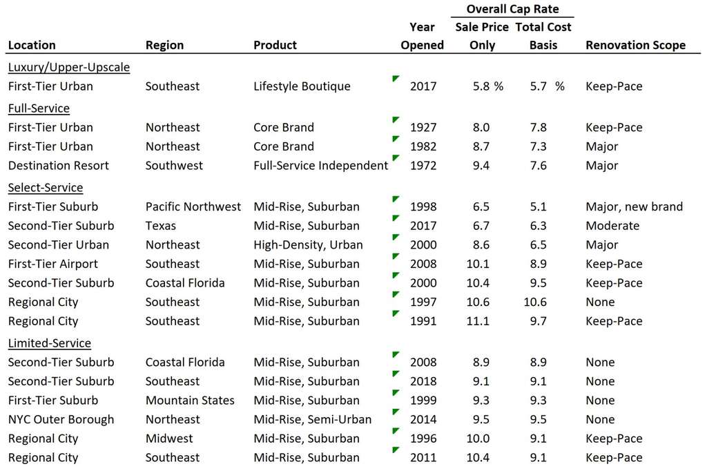 Note that compared to other forms of real estate, hotels are idiosyncratic, and the number of variables impacting the acquisition decision are difficult to objectively account for. The simplicity of the “Value = Net Income ÷ Cap Rate” equation belies the complexity of the underwriting process that typically grounds a hotel buyer’s investment decision. Significant factors can include branding/management issues, opaque buyer/seller motivations, and atypical lease encumbrances, to name just a few. In addition, many transactions are part of large portfolio sales, where sales data is only reported in the aggregate. Nevertheless, the metric is useful because of its simplicity, for giving hotel market participants a tool for communicating with brevity a summary view of an acquisition’s economics, as well as communicating changes in the return thresholds required by hotel debt and equity markets over time.
