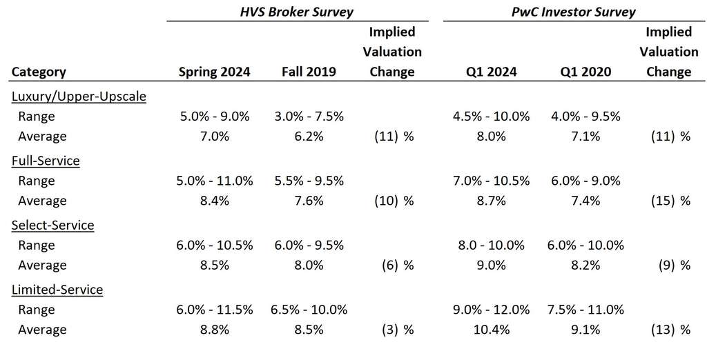 The following table summarizes the results from two surveys of leading hotel investors and brokers with respect to overall, or going-in, cap rates (as opposed to terminal, or going-out, cap rates, an input used in discounted cash flow analyses). The table compares each survey’s current readings with the most recent pre-pandemic readings. The percentage difference in the two readings represents the implied valuation change.
