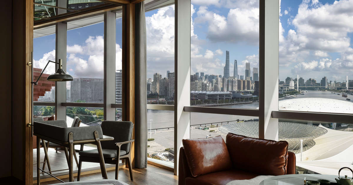 Reflecting the district’s evolution from industrial stage to creative hub, the hotel’s architecture is bold and elemental. Designed by GP Architects New York, its distinctive curved tower is wrapped in a dynamic glass façade that captures the shimmer of the Huangpu River, creating an ever-shifting dialogue between nature and the city.