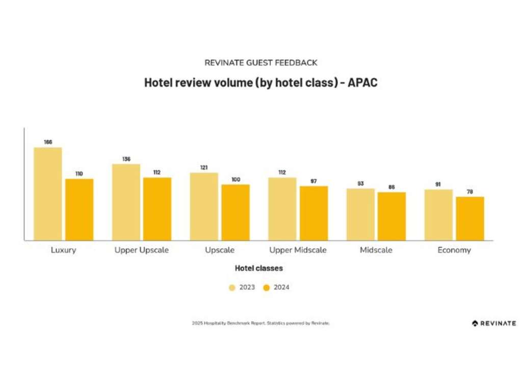 According to the 2025 Hospitality Benchmark Report, APAC hotels experienced the largest decline in hotel review volume worldwide. While the average global review volume dropped by about 15%, APAC hotel reviews dropped by more than 18%.